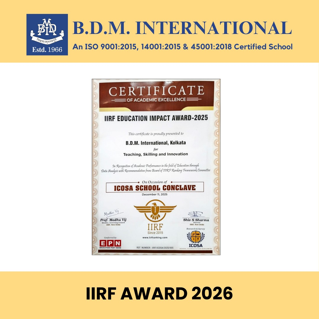 B.D.M. International has been honoured with the IIRF Education Impact Award 2025 at the ICOSA Conclave on December 11, 2025, for excellence in Teaching and Innovation. This recognition reflects the hard work of our students, the dedication of our staff, and the strong support of our parents. Congratulations to the entire BDMI community on this achievement.