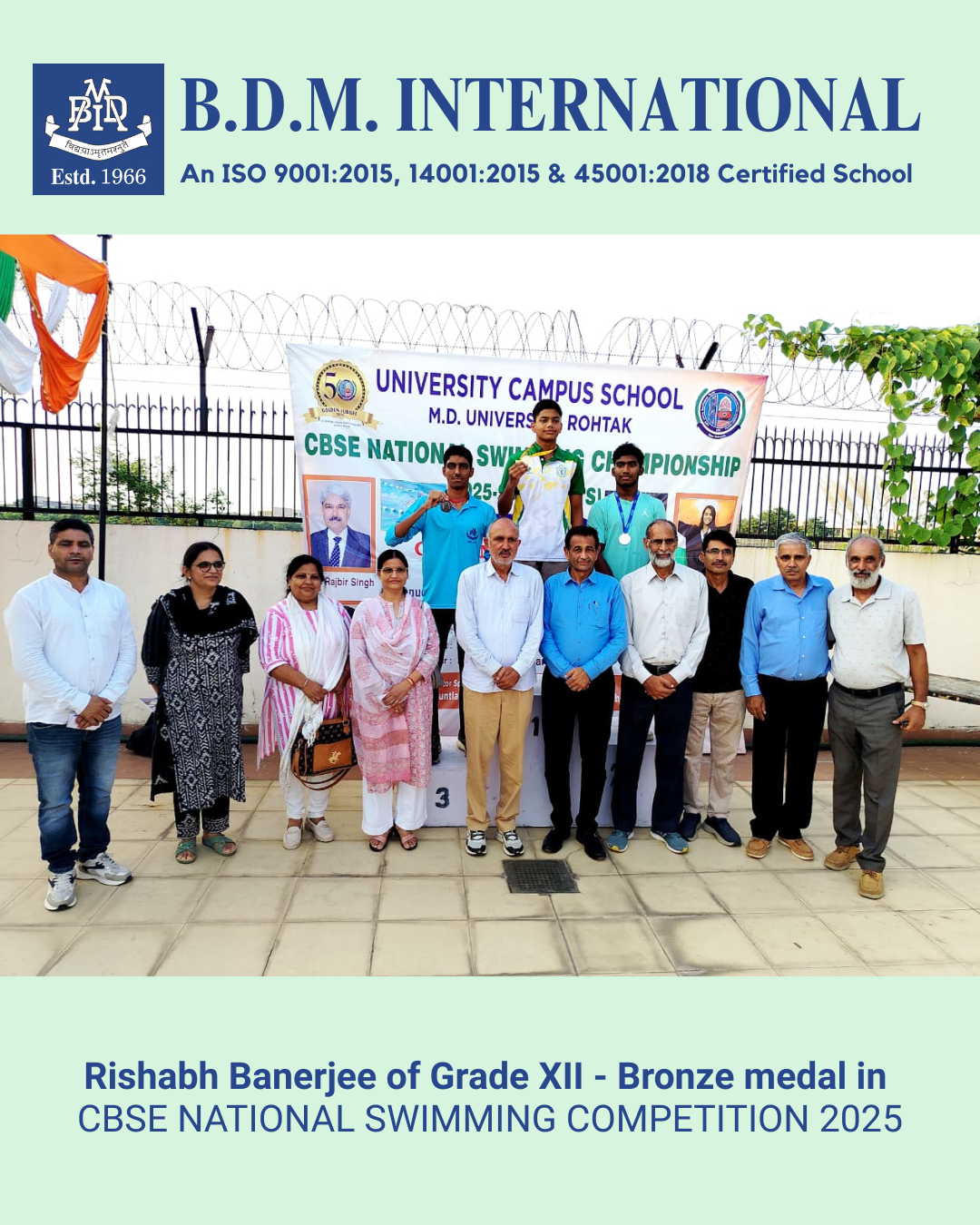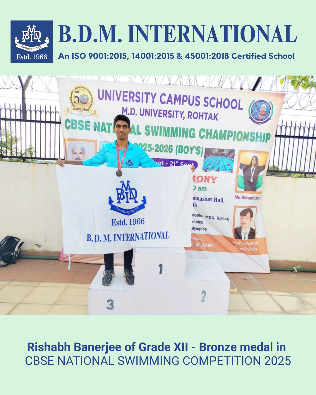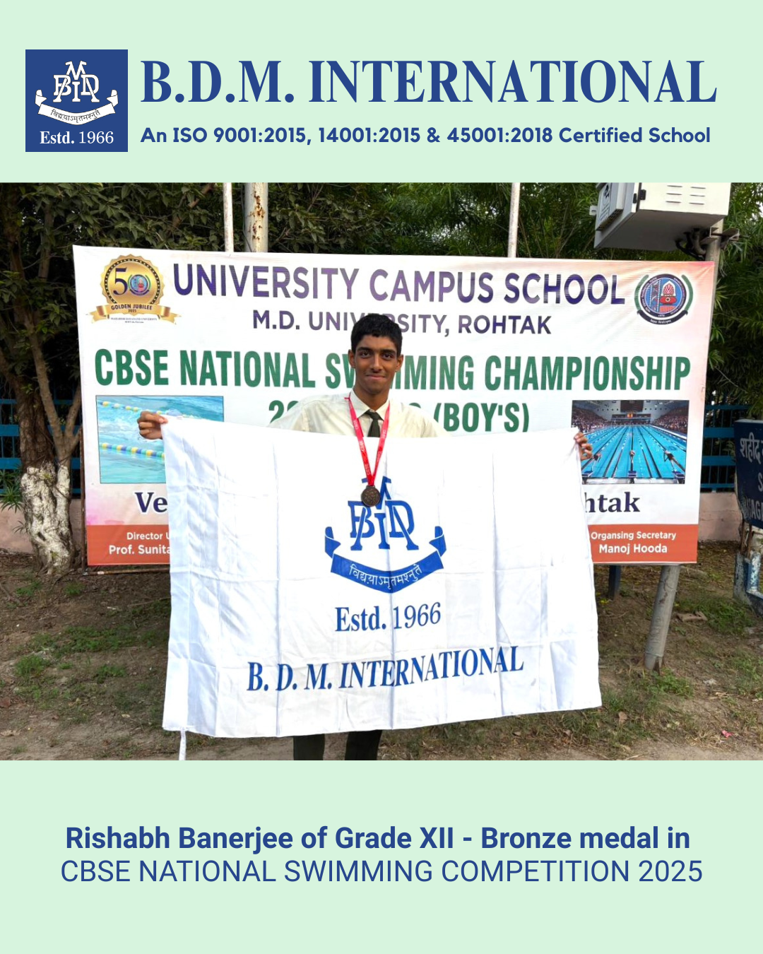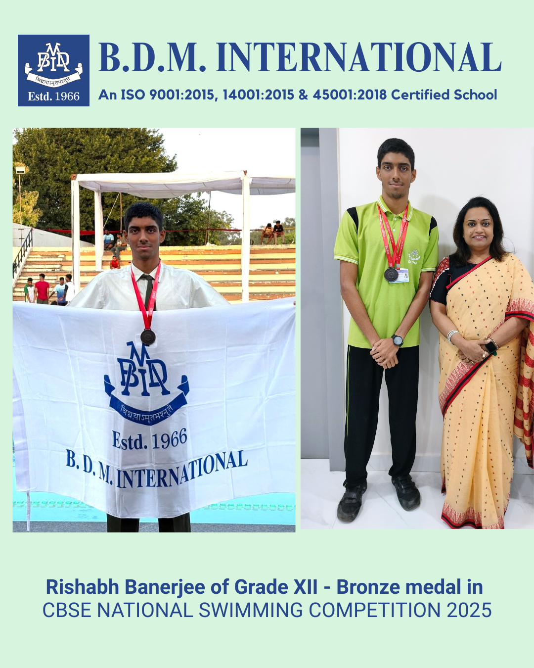 Rishabh Banerjee of Grade XII won 4 Gold and 1 Silver at the CBSE Far East Zone Swimming Competition 2025, held at Sanskar International School, Bargarh, Odisha, from 18th to 20th July. He has qualified for the CBSE Nationals.